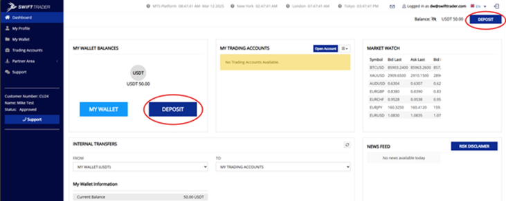 7.入金確認後、SwiftTraderのCRM「ダッシュボード」に反映されます。反映までに少しお時間がかかる場合がございますので、あらかじめご了承ください。