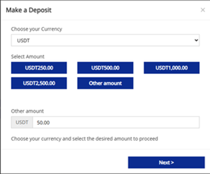 2.入金したい通貨を選択してください。次に、入金したい金額を入力してください。