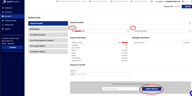 2.資金を移動する取引口座/ウォレットを選択します。次に、受け取り希望の取引口座/ウォレットを選択します。