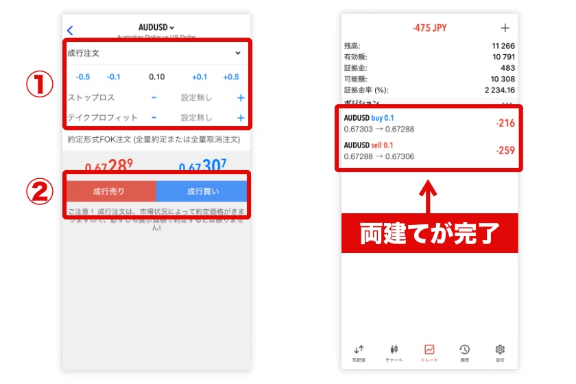 注文発注が完了すると、トレード画面で買い・売り双方のポジションが表示されます。