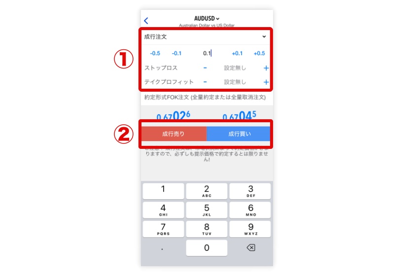 そのまま注文画面に進みますので、注文方法・注文数量を設定後に注文ボタンをタップ。1つ目のポジションを保有します。