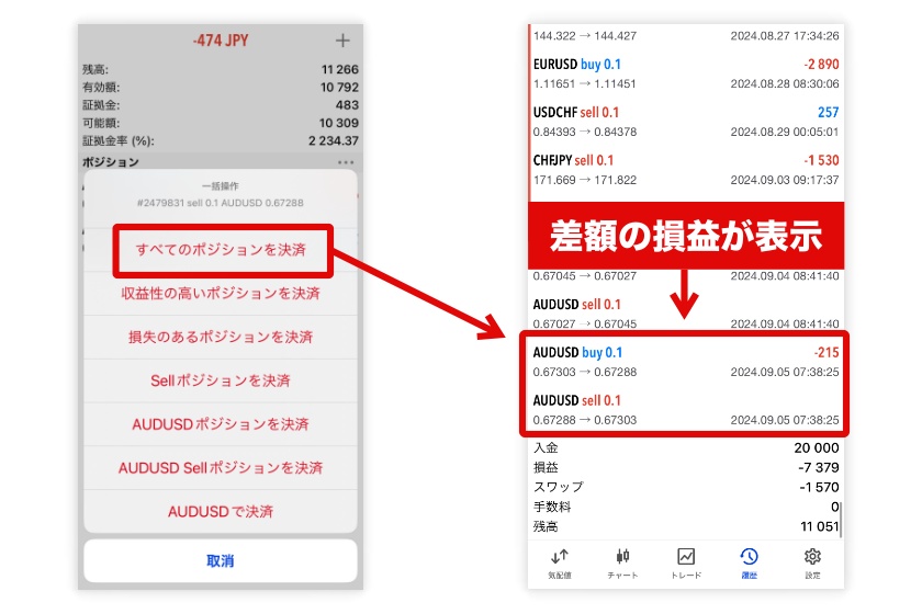 一括操作画面のメニューが開くので、「すべてのポジションを決済」をタップすれば両建ての解除が完了します。MT5の「履歴」を確認いただくと、買い・売り双方の損益を相殺した価格が取引履歴として表示されます。