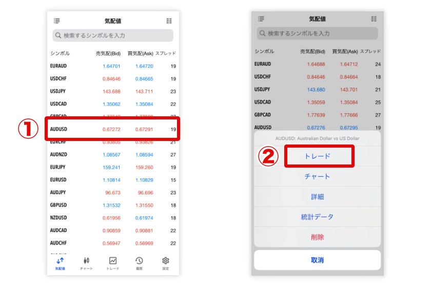 ここでは実際に、Swift Traderで買い・売りポジションを両建てする手順を解説します。まずは通常通り、気配値画面から取引したい通貨ペアを選択し、メニューから「トレード」をタップします。