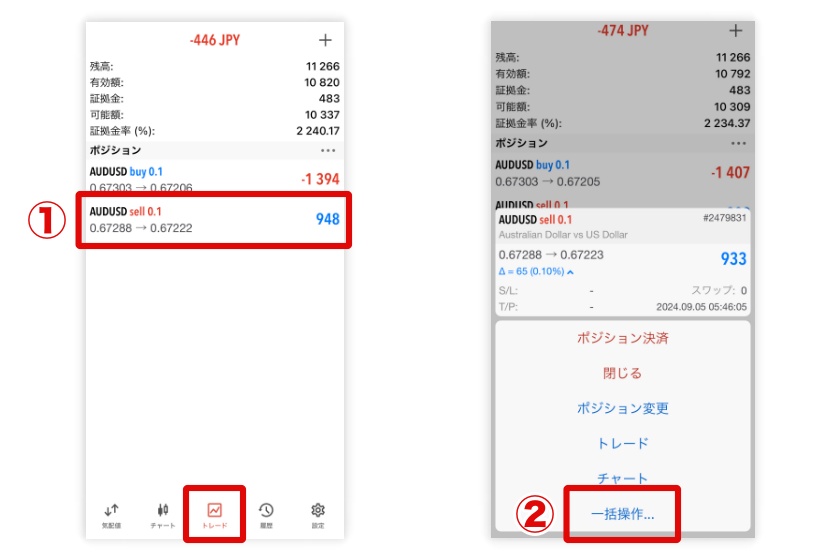 まずはトレード画面から買い・売りどちらかのポジションをタップ。メニュー画面から「一括操作」をタップしてください。