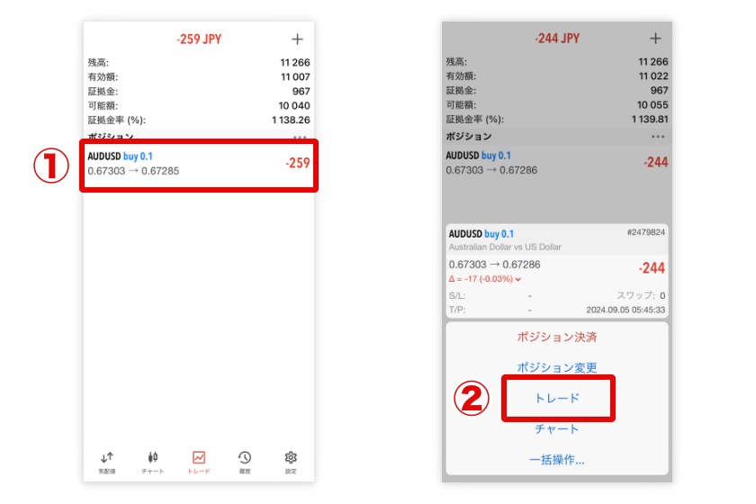 続いて、両建てポジションの保有を進めます。トレード画面から保有ポジションをタップ後、メニューからトレードを選択します。