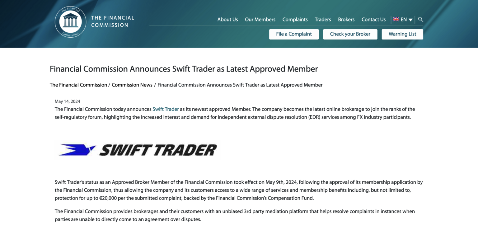 Swift TraderがThe Financial Commissionの承認メンバーになりました。